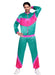 Men's 1980's shell suit fancy dress costume with green, purple and pink top with front zip along with matching elasticated trousers.