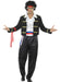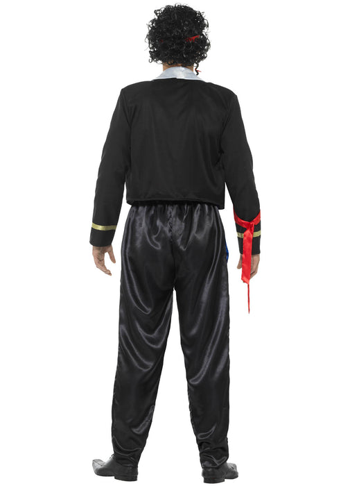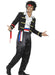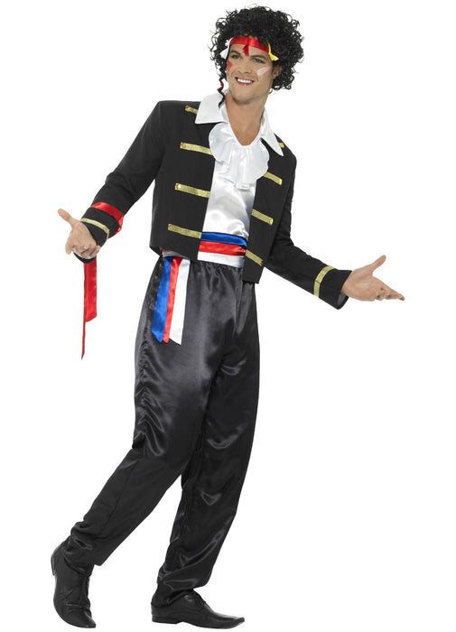 1980's themed New Romantic fancy dress costume consisting of black elasticated trousers with colourful waist band, matching jacket with gold trim and buttons, white mock shirt front & red headband.