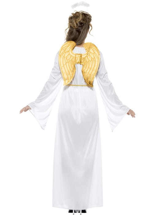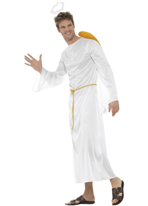 Angel Gabriel unisex fancy dress costume consisting of long white robe, gold rope belt, golden wings & matching white halo.