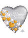 Happy Anniversary silver heart standard size balloon with gold and white decorative hearts pattern.