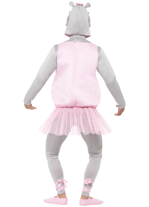 The Ballerina Hippo costume consists of foam bodysuit with attached pink vest and tutu, matching elasticated grey trousers, pair of pink ballerina style shoes with straps & full overhead headpiece with hippo design and pink bow.