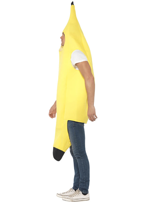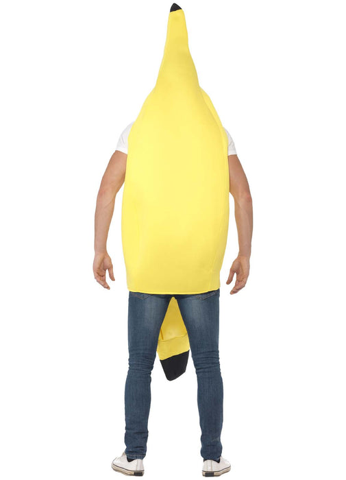 Banana costume adult consisting of long yellow tabard with arms and face slot & black tips.