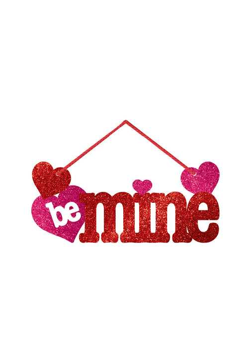 Be Mine pink and red glitter hanging sign decoration with attached netted ribbon.