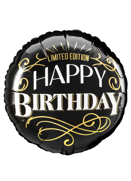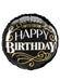 Double sided 17 inch round black Happy Birthday foil balloon.