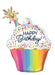 Happy Birthday cupcake rainbow design large balloon measuring 78 cm x 53 cm (31 in x 21 in) when inflated.