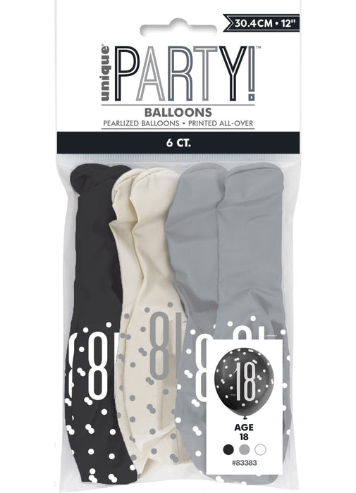 Pack of 6 age 18 Birthday Black Glitz 12" latex pearlized balloons in assorted colours. Printed all over. Supplied deflated and suitable for air or helium inflation.