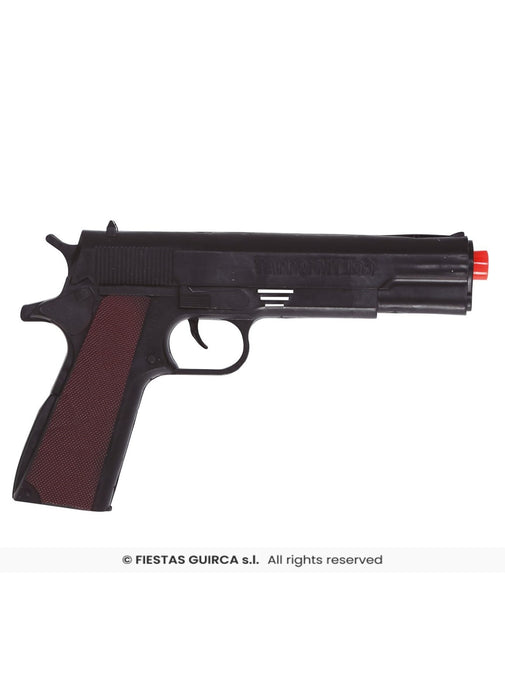 Black plastic pistol with trigger sound measuring approx. 27 cm.