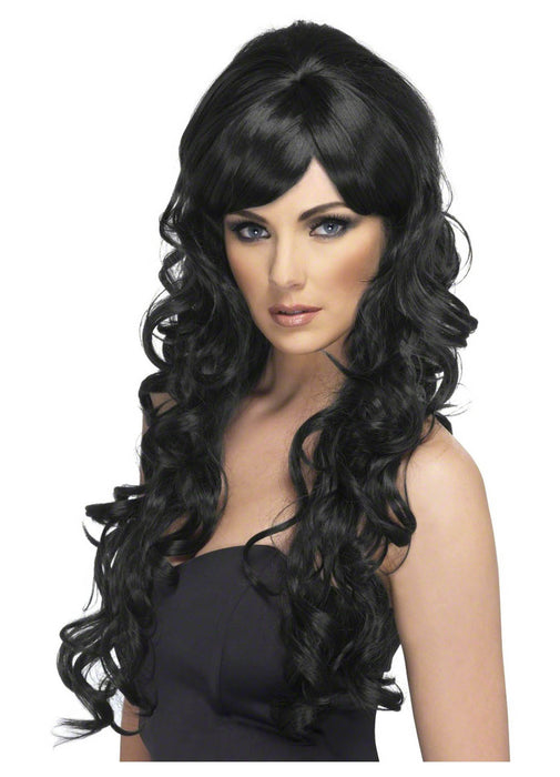 Long black curly pop starlet wig from the Smiffy's Glamour wig collection.