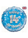 Blue age 14 holographic standard round foil balloon measuring 18" (45.7 cm) when inflated. Made in UK.