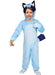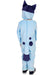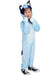 Licensed Bluey costume with blue fleece jumpsuit with padded tail and paws along with character headpiece.