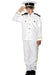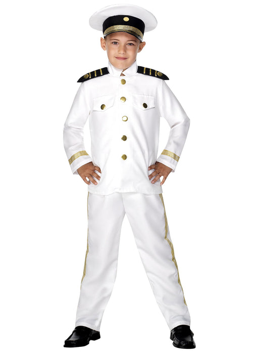 White child's Captain costume with jacket finished with gold buttons and trim with epaulettes, trousers and matching hat.