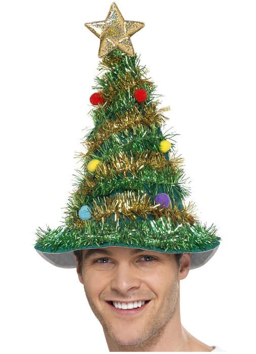 Tall Christmas tree hat decorated with green and gold tinsel & golden Christmas star.