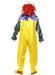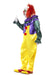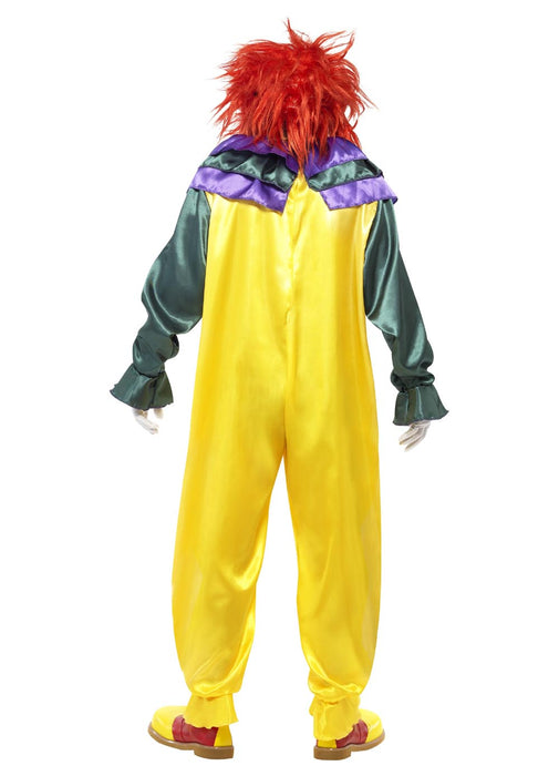 Costume pack includes yellow clown jumpsuit with green and purple upper body and layered collar and red bobble design. Also included is the clown latex mask with attached long frizzy red hair.