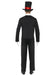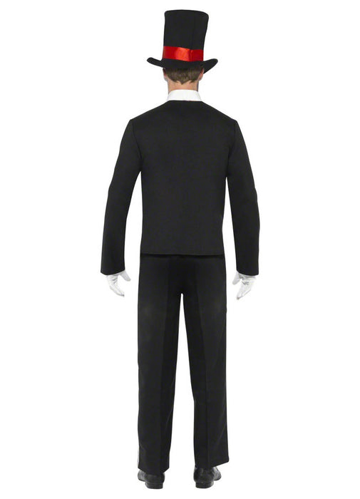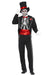 Day of the Dead Halloween costume includes jacket with silver trim and printed rose, mock skeleton shirt front with collar and bow tie, attached red waist cumberband, pair of white gloves and top hat with red ribbon.