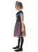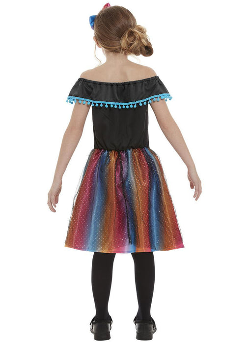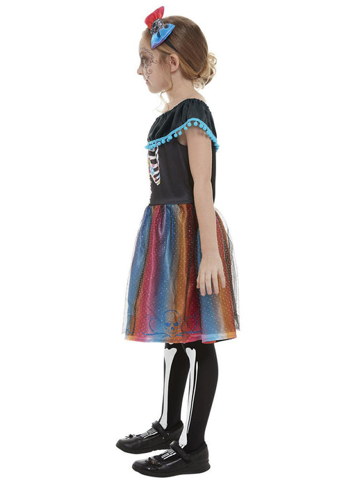 Colourful Day of the Dead girl's costume with layered off the shoulder dress with skeleton print and matching headband.