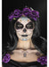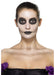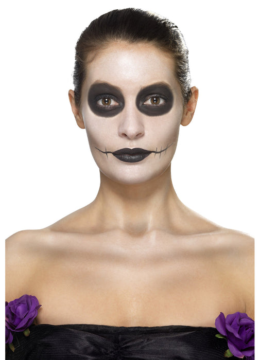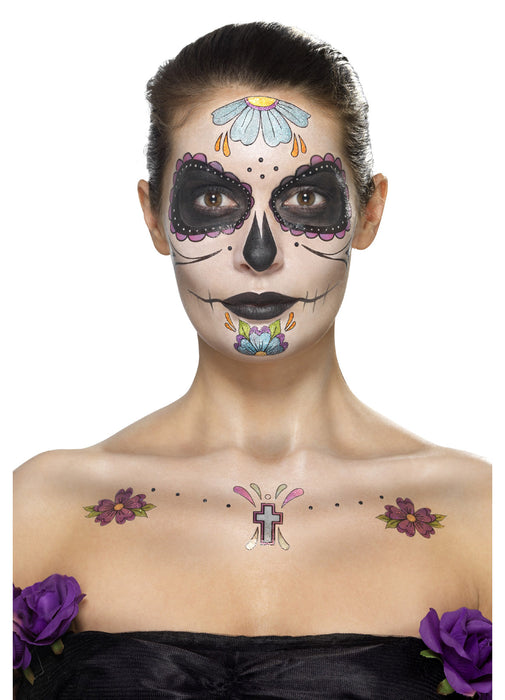 Day of the Dead themed make up kit consisting of flowered tattoo transfers, black gem stickers, black and white face paint pallet, black crayon & applicators.