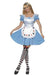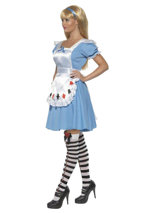 This Deck of Cards costume includes blue dress with lace finish on the sleeves and a white apron decorated with the deck of cards symbols.