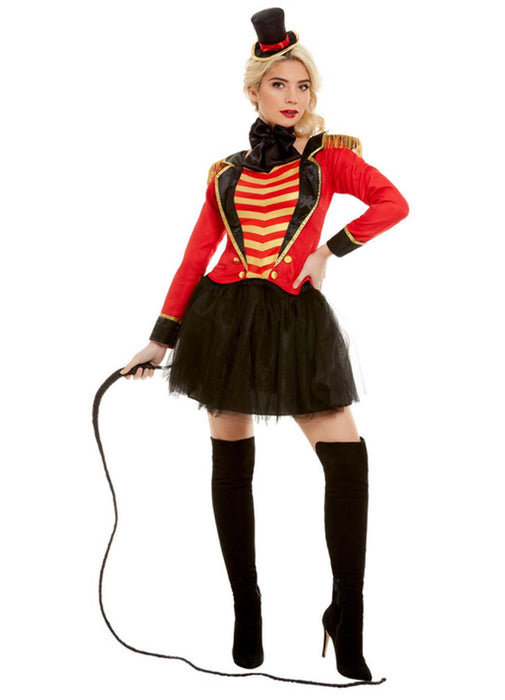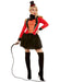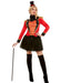 Circus themed lady ringmaster costume in the style of The Greatest Showman. This 4-piece outfit includes jacket with mock shirt, black dress, top hat on headband and black neck bow piece.