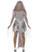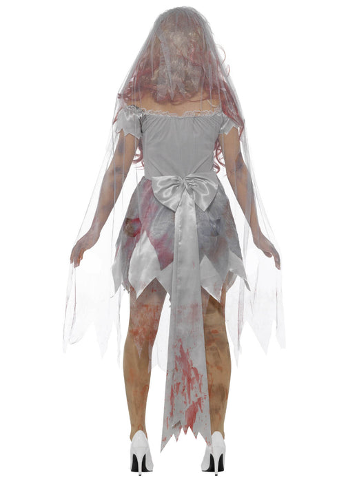 This zombie Bride Halloween costume comes with a grey distressed effect layered dress with blood stains and latex rib wound, long grey headband veil and bouquet of black roses.