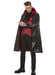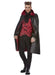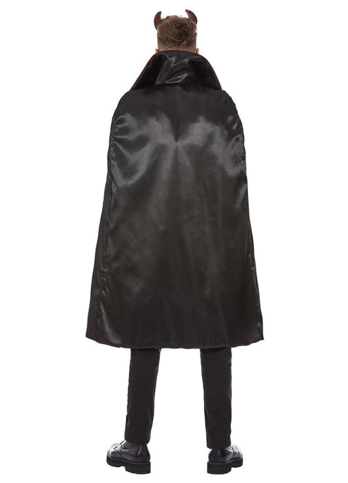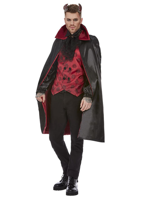 Black and red devil costume with all in one waistcoat and shirt, collar piece, lined 3/4 length cape and grey bloody horns headband.