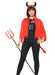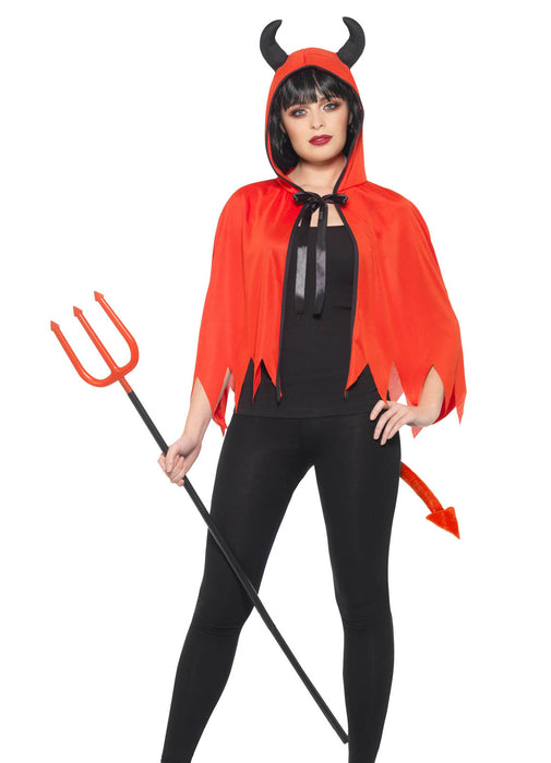 Unisex one size fits most Halloween Devil costume kit consisting of red hooded cape with horns, tail and detachable trident.