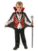 Dracula costume child consisting of bat print waistcoat with attached black bow tie & black cape with stand up collar.