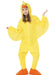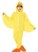 Child's Duck costume consisting of yellow all in one jumpsuit with attached orange feet, attached draped sleeves and hood with eyes and beak detail.