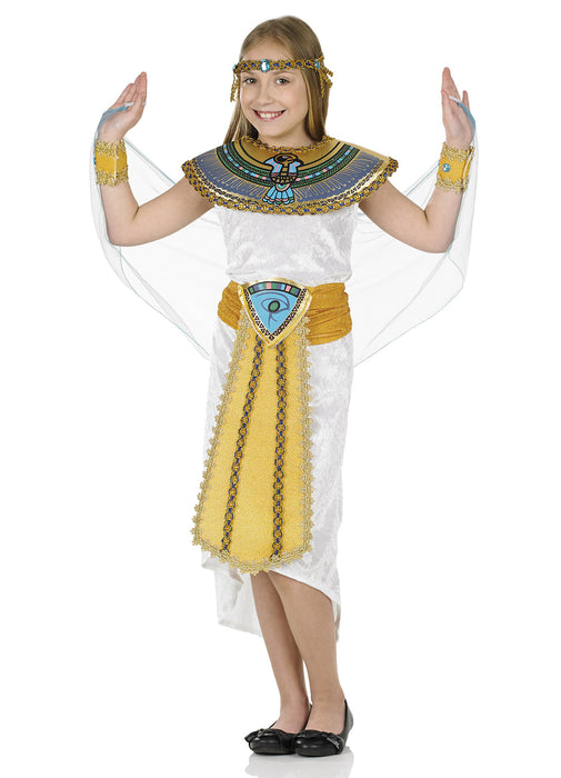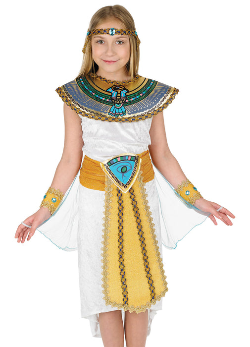 Child's Egyptian girl fancy dress costume consisting of long white velvet effect dress with attached draped sleeves, gold belt with Egyptian print, gold arm cuffs with attached blue jewels, removable collar & matching headband.