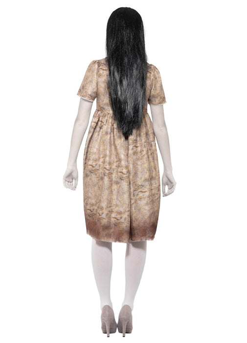 In the style of the horror film The Ring comes this Evil Spirit costume consisting of a distressed decayed look dress with long black wig. Add some tights and make-up to complete the pictured look.