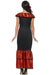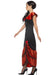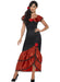 Flamenco Spanish Senorita fancy dress costume consisting of long black dress with red and black polka dot collar and dress trim, black lace decoration & attached red flowers. Also included is the matching red flower hairpin.