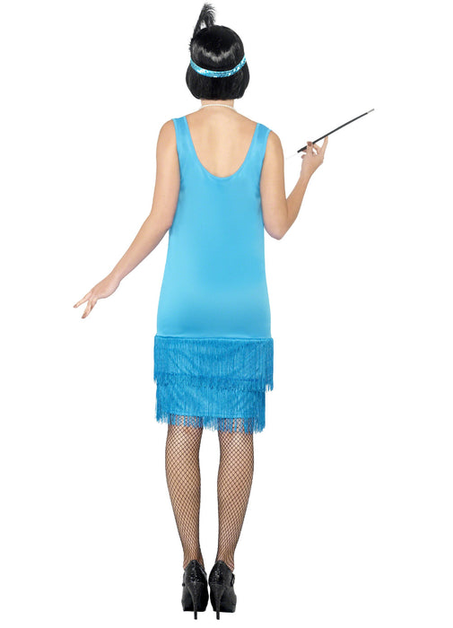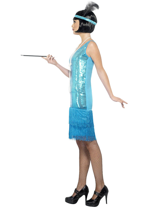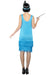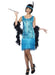 Costume includes blue sequinned flapper dress with dangling tassels, sequinned headband with removable feather and pearl necklace.
