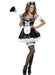 Fever French Maid costume includes dress with corset style tie and attached apron, arm sleeves and headpiece.