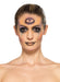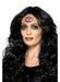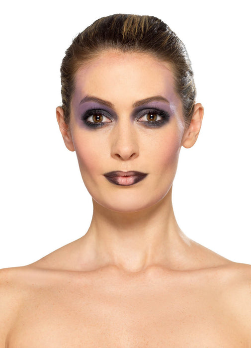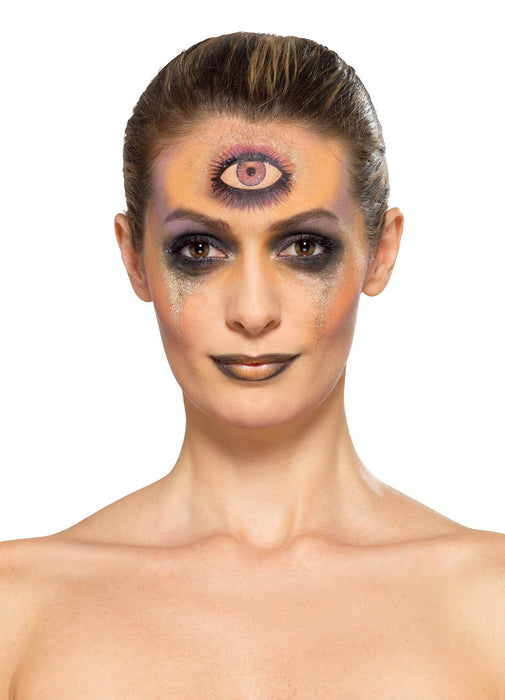 5-piece Halloween occult or fortune teller make-up kit with pallet of aqua face paint in black, bright orange and lilac, pot of shimmer powder, eye transfer tattoo, sponge and brush.