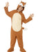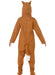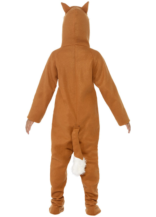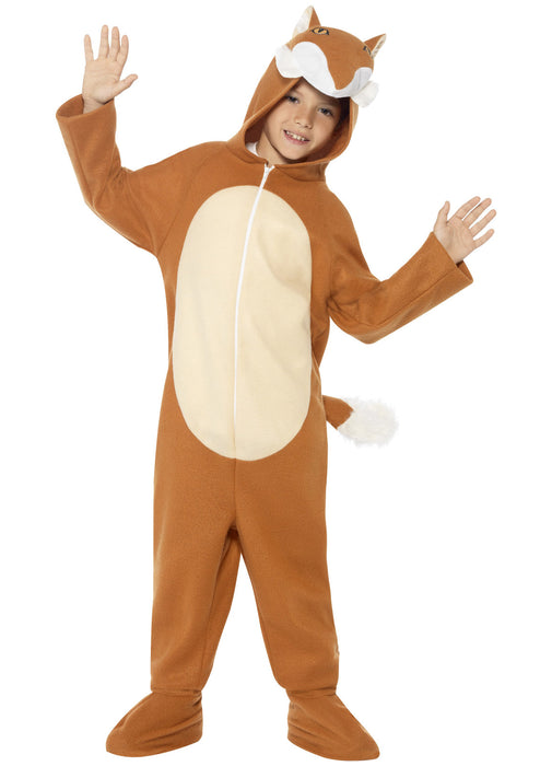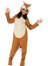 Child's Fox costume consisting of brown all in one jumpsuit with chest panel, attached tail and hood with features.