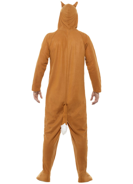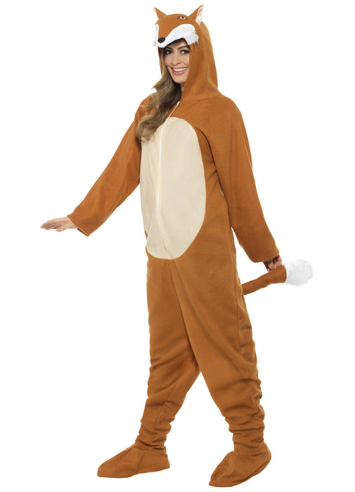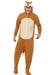 Fox jumpsuit fancy dress costume consisting of full length zip up brown jumpsuit with attached hooded detail.