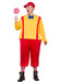 Funny Twin fancy dress costume consisting of hooped one piece jumpsuit with yellow top and red dungaree style design, attached blue bow tie & matching red cap.