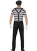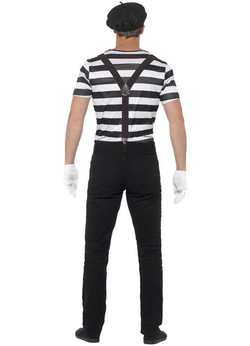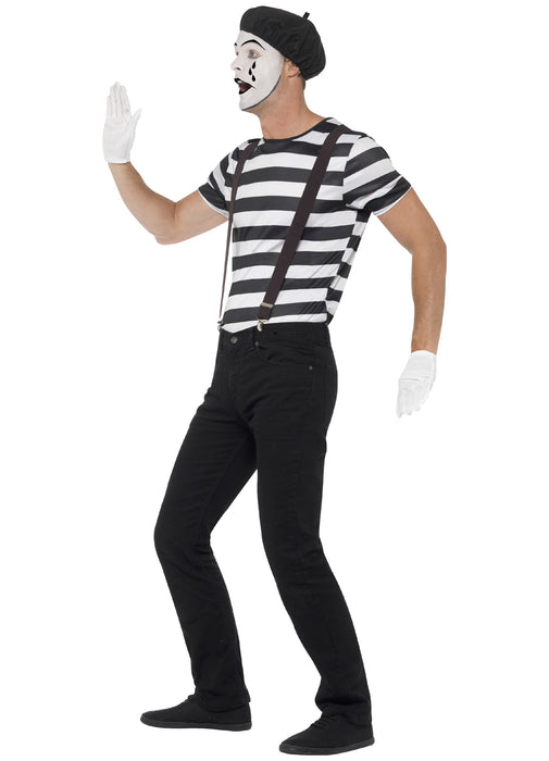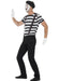Gentleman Mime fancy dress costume consisting of black and white striped top, black beret, pair of short white gloves, black elasticated braces & mime artist make up kit.