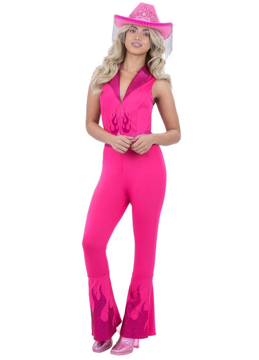 Pink cow girl fancy dress costume consisting of jumpsuit with attached star belt.
