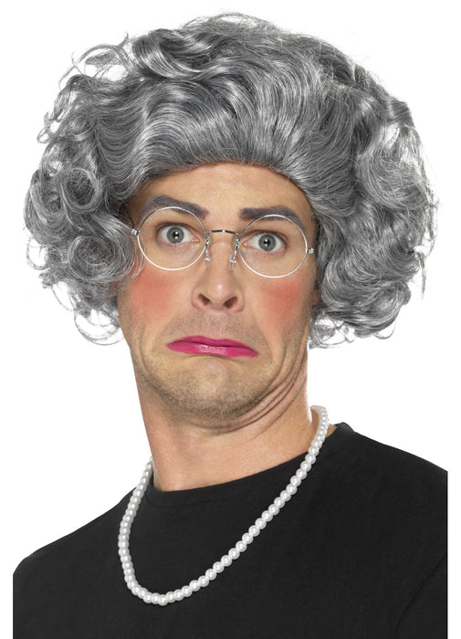 Granny kit consisting of grey curly wig, metal framed glasses & pearl necklace.