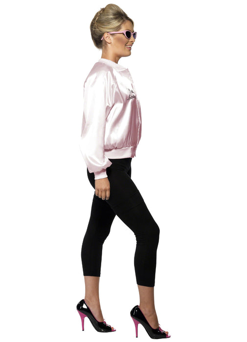 This jacket has 'Pink Ladies' printed in black on the back and on the front right breast. The jacket fastens at the front with a zip and has true 50's style elasticated cuffs and waistband.