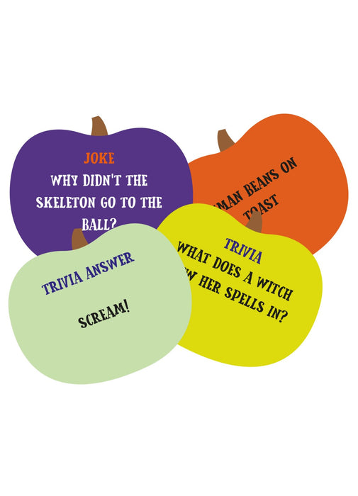 Pack of 30 pumpkin shaped Halloween themed joke and trivia cards for children.