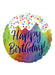 Multi-coloured round happy birthday foil balloon with frosted confetti design.