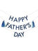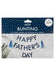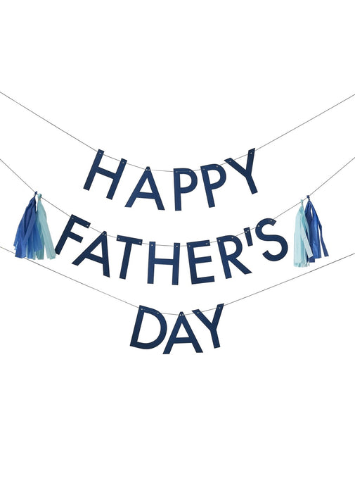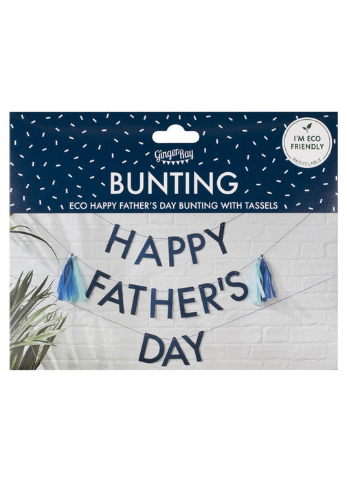 Fully eco navy Happy Father's Day bunting with 4 tissue tassels in light and dark blue and a total of 4.5 metres of blue twine.
