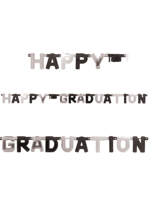 Silver and black Happy Graduation letter banner measuring over 8 ft long (2.52 metres).