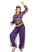 This Harem Princess includes a purple cropped top with gold print and coin detail. The top is detailed with black mesh sleeves and trim. Also included are a pair of matching purple trousers with gold print detail and a black mesh layer. To finish the costume off is a black headpiece with gold embroidery detail.