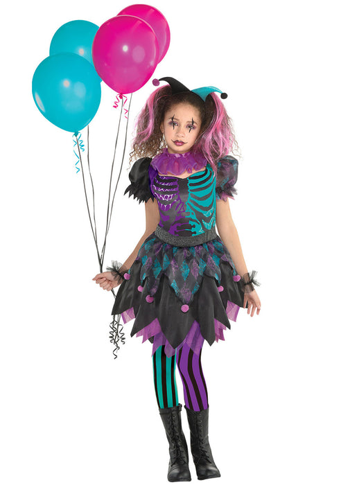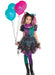 Harlequin jester Halloween costume which comes with dress with underskirt, headband, collar, wrist cuffs and tights.