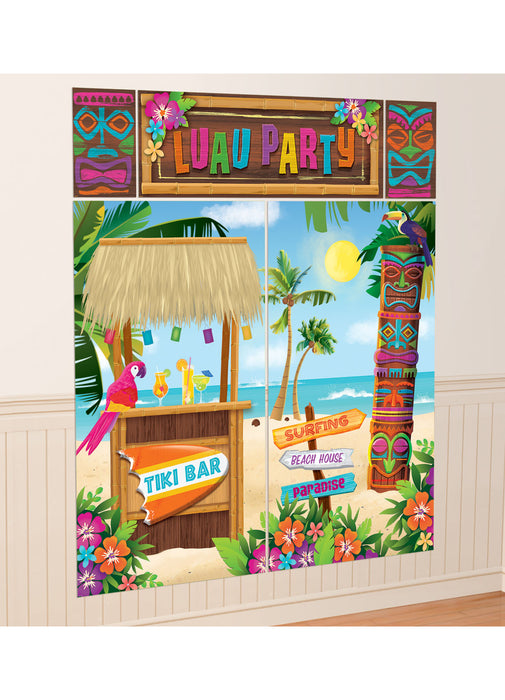 Hawaiian themed tiki scene setter decorating kit consisting of 5 piece poster set decorated with Luau images.