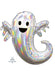 Halloween themed ghost iridescent balloon measuring 25 x 28 inches (63 cm x 71 cm) when inflated.