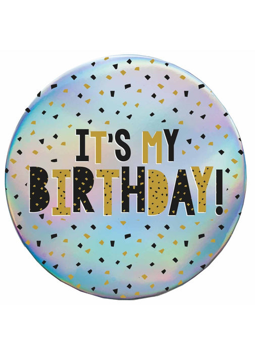 Black, gold & silver It's My Birthday 9 cm pin badge.