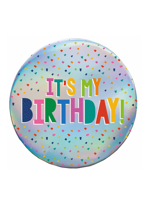 Rainbow coloured It's My Birthday 9 cm pin badge.